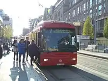 The regular tram service between Sergels torg and Waldemarsudde started on 23 August 2010 with six Bombardier Flexity Classic trams.[1] The cars were at first a dark, almost black, brown colour with gold stripes, as opposed to the traditional light blue trams of Stockholm prior to 1967, however due to complaints this was shortly changed to blue and white. An extension from Sergels torg to T-Centralen opened on 3 September 2018.[2]