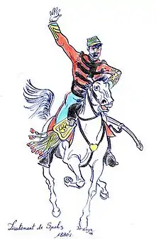 Following the French occupation of Algiers in 1830, detachments of locally recruited irregular horsemen were attached to the regiments of light cavalry assigned to North African service. These auxiliaries were designated as chasseurs spahis. Between 1834 and 1836 they were organised into four squadrons of regular spahis.[1] In 1841 the 14 squadrons by then in existence were brought together in a single corps of spahis. Finally, in 1845 three separate Spahi regiments were created: the 1st of Algiers; the 2nd of Oran and the 3rd of Constantine.[2]