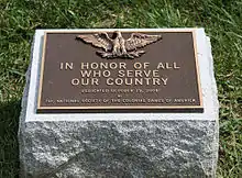 The National Society of Colonial Dames placed a third bronze tablet at the memorial on October 19, 2008. This 12-by-8-inch (30 by 20 cm) tablet has a small eagle, clutching arrows and olive branches, in high relief at the top. It is attached to a rough grey granite base 6 inches (15 cm) high, which is set into the earth on the far western side of the grassy plaza. It is inscribed with the words: