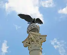 The Spanish–American War Memorial consists of a column of gray granite 54 feet (16 m) high[9] quarried in Barre, Vermont.[20] Atop the column is a bronze eagle with outstretched wings,[9] facing west. The eagle is mounted on a granite globe, which was quarried in Quincy, Massachusetts.[20] A band decorated with 13 stars (representing the original Thirteen Colonies) is carved in high relief on the globe.[9] The globe stands on a square base. The base stands atop a Corinthian capital which crowns the column.[28]