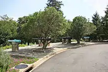 At the rear of the monument across Lawton Drive is a flagstone terrace. Four cannon, mounted on low brick pillars capped with concrete, stand on the eastern edge of this terrace. The guns point east. The inner two guns are larger and more modern, and were taken from the Spanish Navy armored cruisers Vizcaya and Infanta Maria Teresa.[8][9] The two outer guns are smaller and made of bronze, and likely were captured from the Spanish coastal battery Castillo de San Pedro de la Roca at Sevilla near Santiago de Cuba.[9][10]