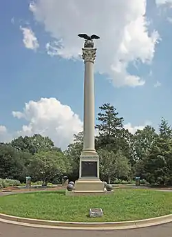 The Spanish–American War Memorial is a memorial in Arlington National Cemetery in Arlington County, Virginia, in the United States that commemorates those American military personnel who died in the Spanish–American War. Constructed by the National Society of the Colonial Dames of America and dedicated on May 21, 1902, the memorial consists of a granite column in the center of a small grass-covered plaza. A granite sphere and bronze eagle with outstretched wings stand atop the shaft. The memorial faces west; to its rear across Lawton Avenue is a flagstone terrace on which are placed four cannon, aimed east.