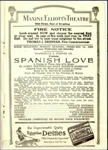Spanish Love is a three-act play by Avery Hopwood and Mary Roberts Rinehart, who adapted an earlier Spanish play, María del Carmen by Josep Feliu i Codina. Producers Lincoln Wagenhals and Collin Kemper staged it at the Maxine Elliott Theatre on Broadway, where it opened on August 17, 1920. Although critics had reservations about the play, the production was a success, running for over 300 performances. However, the play's success was overshadowed by the tremendous popularity of The Bat, another collaboration between Hopwood and Rinehart that opened on Broadway the following week.[2]