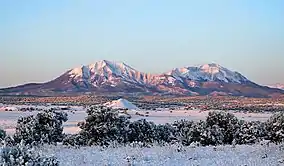 The Spanish Peaks (Spanish: Las Cumbres Españolas) are prominent landmarks along the eastern front of the southern Rockies. Their snow-capped summits of the East Spanish Peak and the West Spanish Peak, rise 7,000 feet (2,100 m) above the arid plains, made the "Double Mountain" an easily recognizable reference point to travelers of all cultures. The West Spanish Peak with an elevation of 13,623 feet (4,152 m), overtops the East Spanish Peak which only has an elevation of 12,708 feet (3,873 m). However, this difference is not readily discernible from a distance.