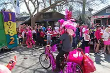 Spanish Town is the site of Baton Rouge's largest Mardi Gras parade, which is celebrated annually on the Saturday before Mardi Gras.[5] The first Spanish Town Mardi Gras parade took place in 1981, as a way for residents to "celebrate their difference".[5] Apparently this first parade was very small, and consisted of a few children on foot who played instruments and threw trinkets to the crowd.[5] It has since grown to include elaborate floats, and has adopted a very sarcastic and raunchy tone; it is not considered "family friendly".[5] Each year has a different theme.[5] The floats typically tend to offer crude political commentary, usually about local and national power figures.[5] There are Krewes, as are seen in the traditional New Orleans Mardi Gras parades, but they are more informal than those, as demonstrated by their humorous names such as "Krewe of Roadkill" and "Wasted Krewe".[5] The unofficial mascot of the parade, which has since become that of the entire neighborhood of Spanish Town, is the pink flamingo.[5]