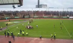 Spain played their first officially recognised match in 1929, winning 9–0 over Italy in the Estadi Olímpic de Montjuïc.[3] During the 1930s the Spanish rugby team played sporadically in the 1930s, playing against the national teams of Italy, Morocco, Germany, and Portugal. Due to the outbreak of World War II, rugby in much of Europe was suspended, and this included Spain. Rugby operations throughout Europe were continued in the 1950s; through this decade the Spanish struggled to the likes of West Germany, Italy and Romania. This pattern of consistency continued somewhat in the 1960s and 1970s; Spain traditionally struggled versus more established opponents such as Romania and Italy, but beat other neighboring sides such as Portugal and Morocco. However, while no official games were played between Spain and the Home Nations or the SANZAR, some Spanish sides traveled to play against various foreign sides.[4]