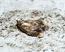 The wingspan is 12–17 mm.[2] The wings are marked dark brown with yellowish in the terminal area and metallic blue-grey streaks. Adults are on wing from May to July.[2]