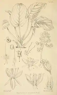 Spatholirion is a genus of climbing or rosette monocotyledonous flowering plants in the dayflower family. It is distributed from China in the north, south to Thailand, Vietnam, and northern Peninsular Malaysia.[2][3][4][5] It has four to eight seeds per carpel, unlike the closely related Streptolirion, which has only two, and white or purple petals.[4] The inflorescence axis of Spatholirion longifolium and all of its branches are a bright purple, probably aiding in visual pollinator attraction.[6] The genus was first described in 1896 by Henry Nicholas Ridley, the father of the commercial rubber industry, from plants sent to Kew Gardens from the Malay Peninsula near the border between Thailand and Malaysia.[7] All species have a diploid chromosome number of 20.[5]
