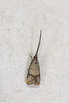 The wingspan is 17–18 mm. The species is characterized by the blackish antenna, the dark brown costa of the forewing and dark brown fascia.