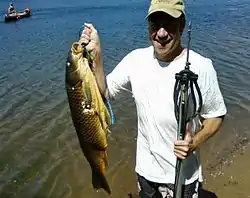 Spear fishing is an ancient method of fishing and may be conducted with an ordinary spear or a specialised variant such as an eel spear[8][9] or the trident. A small trident-type spear with a long handle is used in the American South and Midwest for gigging bullfrogs with a bright light at night, or for gigging carp and other fish in the shallows.
