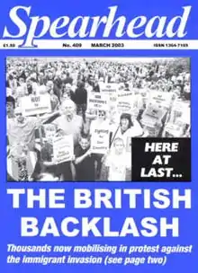 Spearhead was a British far-right magazine edited by John Tyndall until his death in July 2005. Founded in 1964 by Tyndall, it was used to voice his grievances against the state of the United Kingdom. The magazine has not continued under new editorship, although a new article appeared on the magazine's website in October 2010.