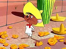Speedy Gonzales is an animated cartoon character in the Warner Bros. Looney Tunes and Merrie Melodies series of cartoons. He is portrayed as "The Fastest Mouse in all Mexico" with his major traits being the ability to run extremely fast, speaking English with an exaggerated Mexican accent, and also speaking in Spanish.[1] He usually wears a yellow sombrero, white shirt and trousers (which was a common traditional outfit worn by men and boys of rural Mexican villages), and a red kerchief, similar to that of some traditional Mexican attires.[2] To date, there have been 46 theatrical shorts made either starring or featuring the character.
