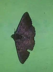 Its wingspan is about 70–78 mm. Adult blackish brown with purplish tinged. Forewings with waved sub-basal, antemedial, and medial black lines. There is a spot in cell and a double post-medial waved line excurved from vein 2 to lower angle o cell. An indistinct sinuous sub-marginal double line also present. Hindwings with medial lunulate line and traces of a sinuous double sub-marginal line.[2]