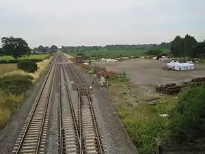 ![]() Station site, looking south. The rightmost of the three tracks is the up goods loop. | |