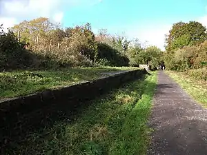 The ‘up’ platform is 300 ft long and was built during reconstruction of the station around 1900. It was used for trains to Blandford, Templecombe, Evercreech Junction (change for the Burnham-on-Sea branch) and Bath (Green Park). This platform opened on 29 April 1901 and was provided with a brick station building containing a booking office, waiting rooms and lavatories. The rear wall of this building still survives as it holds back the field behind the station. The foundations of the various rooms with the three fireplaces can still be seen today.[1]