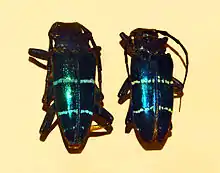 Sphingnotus mirabilis can reach a length of 25–40 millimetres (0.98–1.57 in). Head, prothorax and elitra have a brilliant metallic blue colour. Elyra bears two trasversal whitish or azure bands.