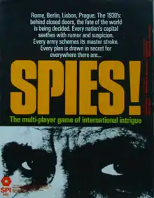 Spies! is a game for 2–5 players. Each player represents one of the Great Powers in the 1930s (France, Germany, Great Britain, Italy and Russia), and attempts to steal secrets in the period leading up to the start of World War II while protecting their own secrets.[1]