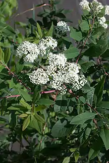 This plant is a shrub growing one to three meters (3–10 feet) tall. It is clonal, with several cloned individuals growing in clumps. The leaves are variable in shape and size and may have smooth or toothed edges. The inflorescence is a dense corymb of many cream-white flowers, each flower about 0.6 centimeters wide. The fruit is a follicle. Flowering occurs in June and July. Though the plant produces many flowers, it rarely reproduces sexually and rarely produces seeds. Instead, it reproduces vegetatively by cloning, producing many new sprouts which grow into shrubs.[3] There are fewer than 30 genotypes in total, meaning there are fewer than 30 individual sets of genes; all the other plants are clones of one of the 30 types.[1]