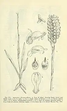 Hooded ladies' tresses was first described by the German botanist Adelbert von Chamisso. He named it in honour of his patron Nikolay Rumyantsev who had financed the scientific exploration to the Americas in 1815–1818 on which he found the orchid. It is common in North America, including Canada and the United States, but also grows in a few locations in Scotland and Ireland.[2] It is now considered regionally extinct in England, but has recently (2019) been found in Wales.[7] The first Irish record was made in 1810 in County Cork.[8] Since then it has been found in a number of other locations in Ireland and Northern Ireland, including the Lough Neagh basin and the Mourne Mountains and the hills of Antrim.[6] It grows along lakeshores and in damp pastures.[5] The distribution pattern, occurring on both sides of the Atlantic Ocean, is puzzling.[9]