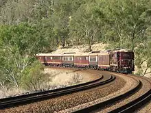The service commenced with SSRS' K205 hauling a power van and three restored carriages hired from Rail Heritage WA that had been restored for the Centenary of the Federation of Australia.[9][10] A further three carriages were acquired between 2003 and 2005.[11][12] All carriages had been built for the Commonwealth Railways to operate on the Trans-Australian Express. The SSRS owned stock was painted in a maroon and cream livery, the hired Rail Heritage WA stock brown and cream. All were of 1,435 mm (4 ft 8+1⁄2 in) and were stabled at the Midland Railway Workshops.[13]