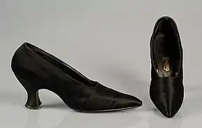 A spool heel is a shoe heel that is wide at the top and bottom and narrower in the middle,[1] so resembling a cotton spool or an hourglass.[2] Spool heels were fashionable in Europe during the Baroque[3] and Rococo[4] periods. Its other periods of popularity include the 1860s[5] and the 1950s.[6] This look has been popularized by John Fluevog.
