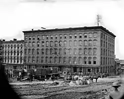 The Spotswood Hotel opened shortly before January 19, 1861, on the southeast corner of 8th and Main streets.[1] The hotel opened three months before the start of the American Civil War in April 1861.[2][3] The hotel was owned by Joseph H. Crenshaw. It was advertised in the Richmond Enquirer as "elegantly finished" and located in the "best part of the city." It also became the quarters for the Richmond Howitzers, a Virginian militia, and later the location of the Confederate Post Office.[4][5]