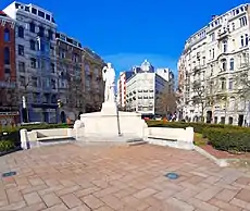 From the outset, the square was embellished with a triangular parterre on the boulevard's side, which in 1924 welcomed the Monument to the Showmen who died for the Fatherland. In 2005–06, the space was redesigned as a pedestrian area, with the exception of the western end, where a carriageway connects the Rue Lambert Crickx and the Rue de l'Autonomie. The narrow part of the square now houses a fountain.[1]