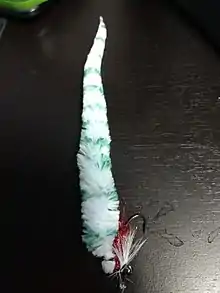 Squirmles have gained an unexpected second life as a material used in fly fishing.[2] Re-branded as "Dragon Tails,"[3] they can be tied onto a hook and the same properties which made them appear like live worms on land, make them appear lifelike to fish as well.