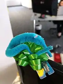 Squirmles (also known as Snoots, Magic Twisty Worms, or Worm on a String) are small, worm-like toys with eyes, a furry body, and a hidden string used to imitate a live worm, sometimes used as a magic trick. A popular toy released in the late 1970s by the Illfelder Importing Company,[1] Squirmles come in a variety of colors and are measured at 8.5 in by 0.5 in. They are typically found in discount stores in the United States. In 2017 they began being referred to mainly as "Worm on a String", and in 2020 as "wormies" or simply "worms".