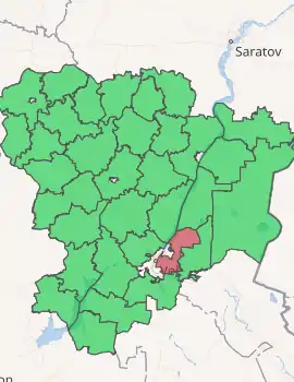 Sredneakhtubinsky District (Russian: Среднеахту́бинский райо́н) is an administrative district (raion), one of the thirty-three in Volgograd Oblast, Russia.[1] As a municipal division, it is incorporated as Sredneakhtubinsky Municipal District.[7] It is located in the southeast of the oblast. The area of the district is 2,039 square kilometers (787 sq mi).[3] Its administrative center is the urban locality (a work settlement) of Srednyaya Akhtuba.[2] Population: 58,962 (2010 Census);[4] 55,341 (2002 Census);[9] 48,555 (1989 Census).[10] The population of Srednyaya Akhtuba accounts for 24.5% of the district's total population.[4]