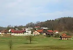 Srednja Vas is a clustered settlement below Hrastovec Hill (elevation: 407 meters or 1,335 feet), a foothill of Golovec Hill.[1][2] It is connected by road to Daljna Vas to the west, Orle to the northeast, and Sela pri Rudniku to the east.[2] The Grivka embayment of the Ljubljana Marsh, with fields, meadows, and Grivka Creek, lies south of the settlement. To the north the land is forested, especially with chestnut trees, and the woods contain blueberries and mushrooms that the locals traditionally gathered to sell.[2]