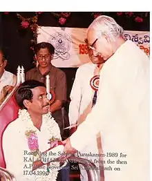 ![]() Sriraj receiving Sahithi Puraskaram 1989 | |