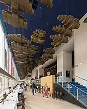 The new house was decorated by a large painting commissioned from Marc Chagall in 1959, Commedia dell’Arte.[4] The ceiling of the foyer which is common for play and opera is decorated with a sculpture by Zoltán Kemény, Goldwolken (Golden Clouds).[5] The house was opened in December 1963.[5]