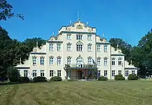 After he became owner of the estate in 1834, Posse had the original manor house knocked down for his new construction, which was completed in 1860. The central part of the castle is four storeys high, and each surrounding part is a level lower, ending with a single storey pavilion on each side, and the whole was originally surrounded by parkland in the romantic style. The stepped sections, together with the pediment on the central block, are decorated with volutes, and the pediment is also decorated with the Posse coat of arms. The building's most impressive room is a music room extending vertically through two storeys and crowned by a glass cupola.