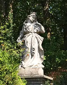 St. Adeloga of Kitzingen, also known as Hadeloga and Adela, is a German saint.[1] Her father was Charles Martel, a Frankish statesman and military leader.[2][3] She was a princess[4] and "of singular beauty".[2] She was sought after for marriage, but she refused, wanting to devote herself to God instead. Her father treated her with "studied brutality and public insult";[2] she went to his chaplain, who was also her spiritual director, for support and advice, so Martel expelled them both from his palace. They journeyed to Kitzingen, in modern Bavaria, a "wild and desert place",[2] where they built a convent. She was made the convent's first abbess; the convent attracted virgins and was directed to follow the rules of St. Benedict and St. Scholastica. Martel later reconciled with and visited Adeloga, and donated lands for her convent.[2]