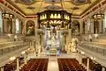 The current church was designed by architect Napoleon LeBrun, who also designed the Academy of Music. The church is an example of Palladian architecture. The main arched altar consists of white marble with shafts of Mexican onyx that border the tabernacle. Framing the altar is an archway supported by Corinthian columns. Above the altar sits a domed skylight. Stained-glass windows, each dedicated to a saint, allow in light throughout the church.[3]