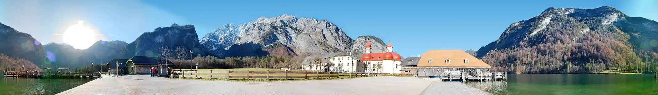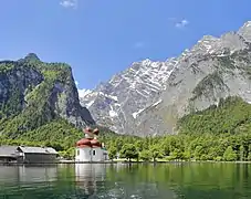 St. Bartholomew's (German: St. Bartholomä) is a Roman Catholic pilgrimage church in the Berchtesgadener Land district of Bavaria in Germany. It is named after Saint Bartholomew the Apostle (Bartholomäus in German), patron of alpine farmers and dairymen. The church is located at the western shore of the Königssee lake, on the Hirschau peninsula. It can only be reached by ship or after a long hike across the surrounding mountains. A first chapel at the lake was built in 1134 by the Provosts of Berchtesgaden. In 1697 it was rebuilt in a Baroque style with a floor plan modeled on Salzburg Cathedral, two onion domes and a red domed roof. The church features stucco work by the Salzburg artist Joseph Schmidt and a three-apse choir. The altars in the apses are consecrated to Saint Bartholomew, Saint Catherine, and Saint James respectively.