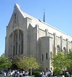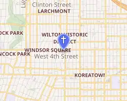 The parish opened a parochial grammar school in 1915 on Western Avenue, which still operates at that location.[2] In 1927, the parish built the large brownstone Gothic church that has been used by the parish for more than 90 years.[1] At the time of the new church's dedication in January 1928, the Los Angeles Times noted that the "beautiful" new church had cost $400,000, and reported: "The new building is in the Old English Gothic style and is considered one of the handsomest structures of its kind in California."[3] Designed by architect Emmett Martin, the church has been called "one of the archdiocese's architectural gems."[4]