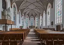 The rebuilding began at Pentecost 1950 and was completed in October 1954. The architects were Theo Kellner and Wilhelm Massing. The exterior was restored similar to the previous appearance. The interior was the subject of long debates. The wooden ceiling was reconstructed, while the ceiling of the nearby church Liebfrauen was not restored to its Gothic vaults. The multiple Baroque galleries on three sides were not restored, but replaced by a single simple gallery in the west which became the place for the organ. Below the gallery, a hall for meetings and one for weddings were installed. The main entrance was changed from the north to the west. The walls were kept plain white, and furnishing such as altar, benches and lighting were kept intentionally simple, in keeping with the mood of the 1950s. The main decoration of the church are 17 stained windows created by Charles Crodel.[1][10][11]