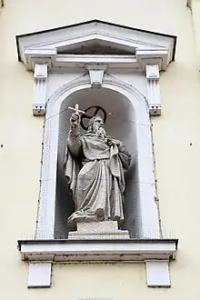 The main decorative elements of the facade are the niches which contain three statues by Gyula Szász from 1881. The sculptor was commissioned by the municipality on 16 October 1880 for a payment of 1200 forints, and the three figures were made of Sóskút sandstone.[15] The figure of Saint Gerard Sagredo is a visual reference to the medieval origins of the parish, which was founded after Gerard's canonization in 1083 (the bishop was martyred nearby at the foot of Gellért Hill). Saint Charles Borromeo was a popular saint of the Catholic Counter-Reformation period, when the parish was re-established after a long hiatus, and the new church was dedicated to Saint Catherine.