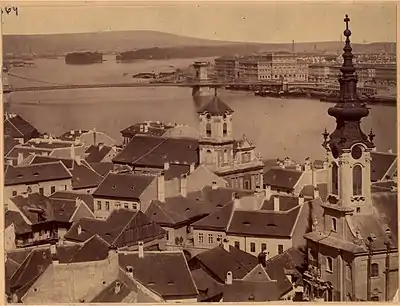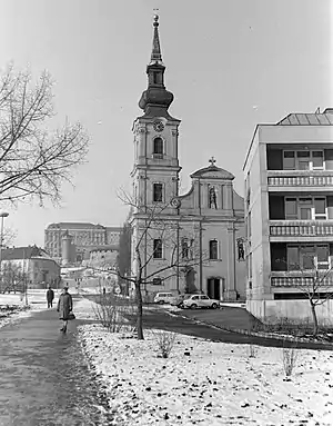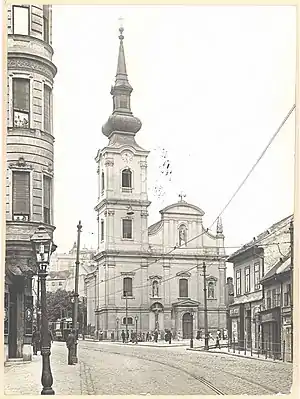 The church burned down completely in the Great Tabán Fire of 1810 which destroyed the whole district. "The tower of the Catholic church in Rácváros caught fire after midnight yesterday, and collapsed horribly in the morning; the church itself also burned, illuminating this terrible night", as a contemporary report claimed.[8] The reconstruction was begun by József Dankó the Elder in 1812 and it was finished by Ludwick Kimnach in 1818.[9] Due to a shortage of funds, the ornate spire of the tower was replaced with a symple pyramidal roof in 1823. The interior and the new furniture was not finished until the 1830s. A new parish house was also built in 1818-19.