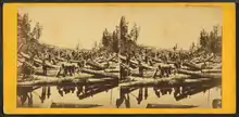 The lumber industry continued to grow throughout the latter half of the 19th century, with progressively larger spring drives and consequent dangers to navigation on the river above Stillwater. Logs were frequently caught in log jams at the narrow Dalles of the St. Croix River, and in 1883 the blockade was so severe it took almost two months before the flow of logs was re-established.[7]:76 The 1886 jam, described as the "jammedest jam", required the use of steamboats and dynamite to clear. At its peak in 1890, logging in the St. Croix River valley produced 450,000,000 board feet (1,100,000 m3) of lumber and logs.[14] The lumber industry continued until the last major log drive in 1912 marked the end of the rich white pine forests of the area.