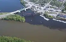 Aerial photo near Prescott, Wisconsin, where the clearer waters of the St. Croix meet the muddier Mississippi River.