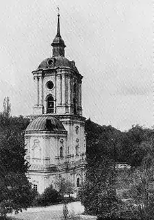 Of the monastic buildings Ivan Hryhorovych-Barskyi constructed within the monastery, his most important construction was a free standing belfry, built in 1760.[2] The belfry combined the idea of a tall campanile with a gate on the ground level and a chapel on the belfry's second tier. The two lower levels of the belfry had some elements of a Ukrainian tripartite church, consisting with the belltower placed over the central part of the nave.[2] This architectural combination in a belfry with two apse-like lower elements on each side. The original roof above the belfry's chapel was a stepped-hipped roof, which was popular at the time.[2] After the fire of 1849, the roofs over the chapel and the cupola were modified from the original. After the Ukrainian SSR's decision on the demolition of the belfry in 1936, the belfry was destroyed a year later, to be used as bricks in construction projects.