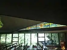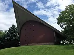 Designed by architect William P. Wenzler and completed in 1957,[12] the building on Watertown Plank Road in Elm Grove included one of the first hyperbolic paraboloid roofs in the United States.[13] The roof was made of poured concrete and extended 45 feet beyond the altar, which was hung with a crucifix created in an abstract style and lit through natural light.