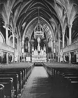 Land for the church was donated by Henry J. Anderson, Professor of Mathematics at Columbia College. A parochial school, located at 311 East 36th Street, was organized in 1860. The first floor of the boys school was the chapel, where Sunday Masses for the 1,500-member congregation were held.[3] St. Gabriel's Church was dedicated on November 12, 1865, by Archbishop John McCloskey. Two of St. Gabriel's priests at the turn of the century later served as Cardinal Archbishop of New York, John Murphy Farley and Patrick Joseph Hayes.[4]