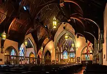 The exterior was constructed in carved sandstone with stained glass windows, and the interior is devoid of any pillars, and features traditional English woodwork inside the chapel. The church is also notable for its ceiling beams, which are among the largest in the world.[3] The exposed double-beam hammer roof is second in the world only to the Westminster Hall in span.[4] The tapestry originates from Westminster Abbey in London, where it was used during the coronation of Queen Elizabeth II.