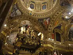 St George's Basilica's first organ was first introduced towards the late 17th or early 18th century, after the parish church had been rebuilt in the size and shape that it largely is today. With the organ, built by Santucci from Sicily in 1781 and installed high above the West door, a tradition of organ music was launched which continues to this day. Later a small portable organ joined the Baroque one for daily Church services.[9][10]