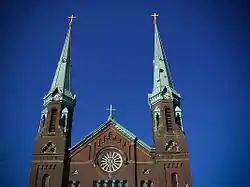 The red brick church was designed by Samuel Hannaford in the Romanesque Revival style, and opened in 1873. Construction costs totaled $80,000.[2] Declining attendance brought about by shifts in neighborhood demographics and worship habits in the 1970s and 1980s led the Roman Catholic Archdiocese of Cincinnati to consolidate the parish with St. Monica's and close the church in 1993. The property was sold the following year to a group called the Christian Ministries Center, which operated a community and arts center out of it until 2004. St. George's two steeples caught fire and partially collapsed on February 1, 2008.[3]