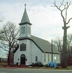 St. Ignatius Church is a Roman Catholic parish church of the Archdiocese of Washington located at 2315 Brinkley Rd., Fort Washington,[2] MD 20744, in Oxon Hill, Prince George's County, Maryland. The historic church structure was constructed between 1890 and 1891. The 1+1⁄2-story structure is wood frame, with clapboarding, and shingling in imbricated pattern. It is rectangular in form with a gabled roof, 80-foot (24 m) projecting front belfry with spire and louvered openings, round arched openings, and modified corner buttresses. The architectural style is considered Eclectic, with elements of the Shingle and Queen Anne styles. It is the second church on site and has served as a mission and parish church.[3] The original church, built in 1849, was partially funded by Mary Surratt, one of the conspirators involved with the Assassination of Abraham Lincoln.